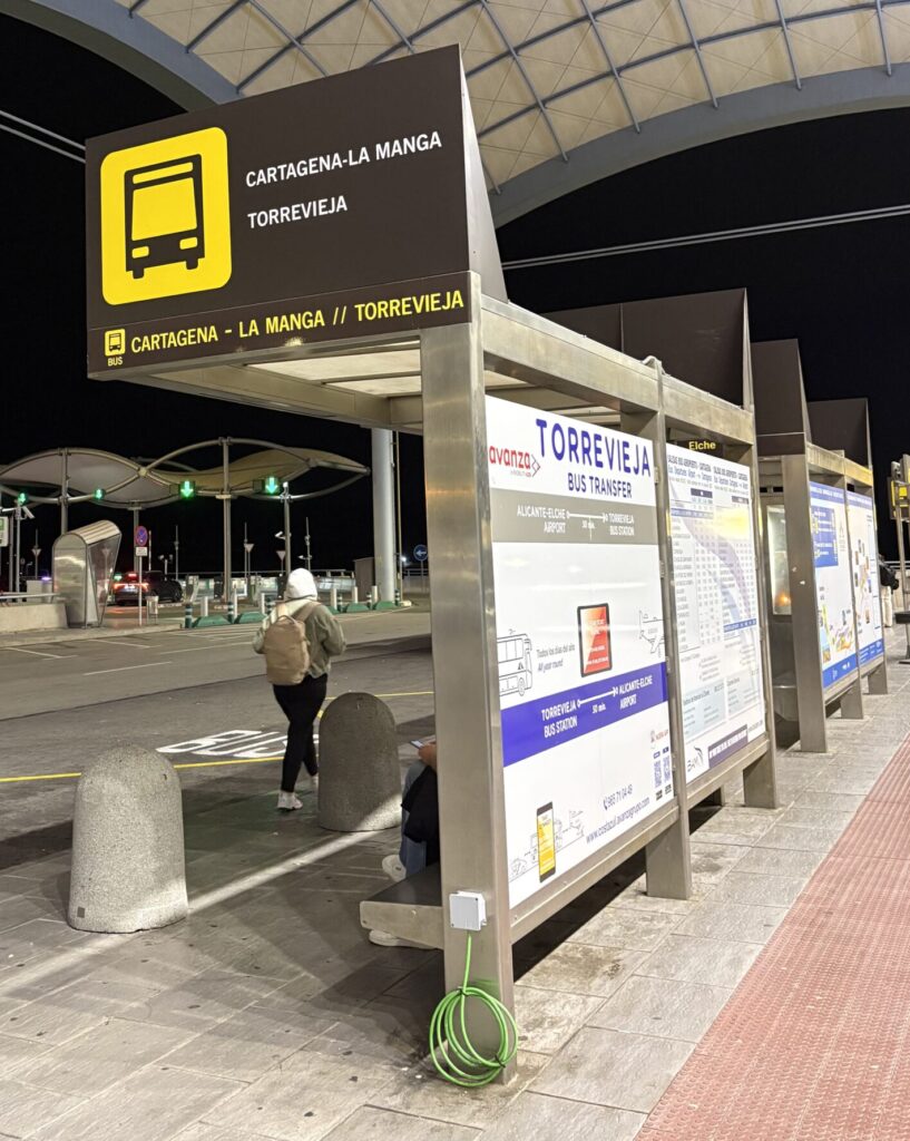 • Bus – Bussen afgår lige ude foran lufthavnen, normalvis med afgange mindst én gang i timen. Busturen tager 45-60 minutter og koster 7 € pr. person. Bussen kører direkte til Torrevieja Station, så der er ingen stop undervejs. Der kan bestilles billet kontakt i bussen, eller via linket her. Bustiderne kan ses her.
